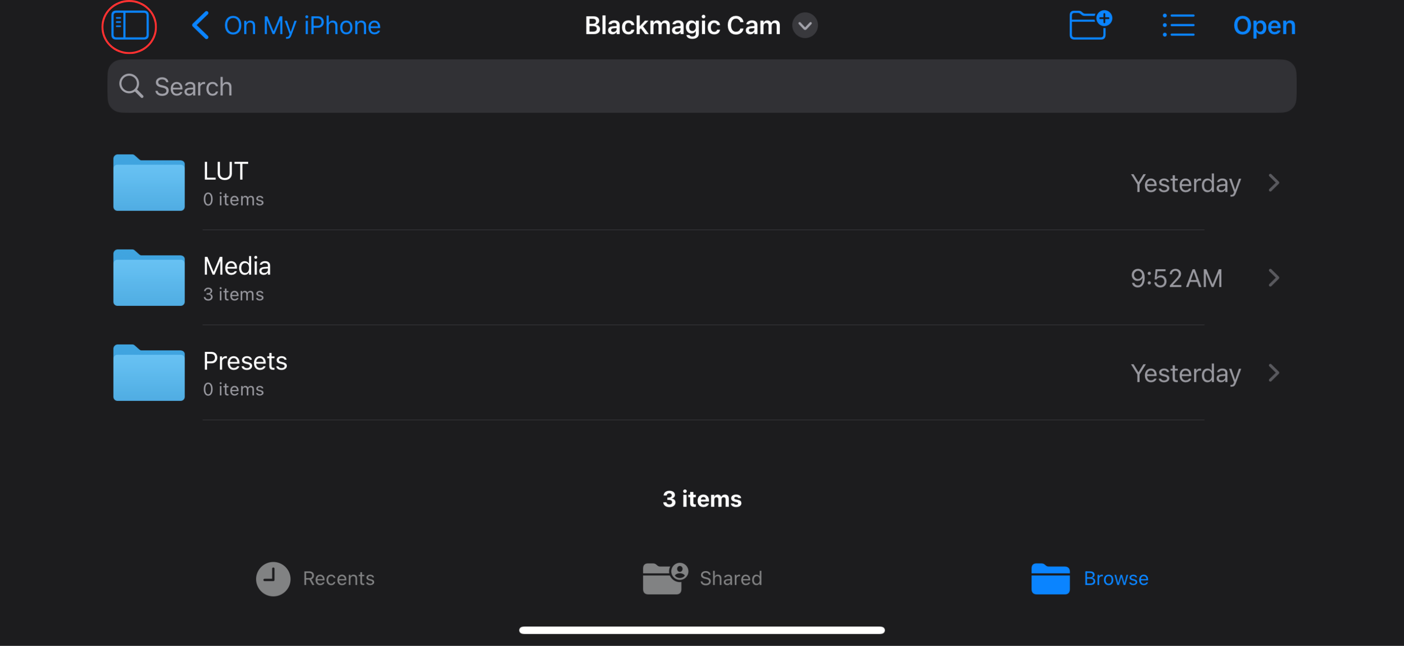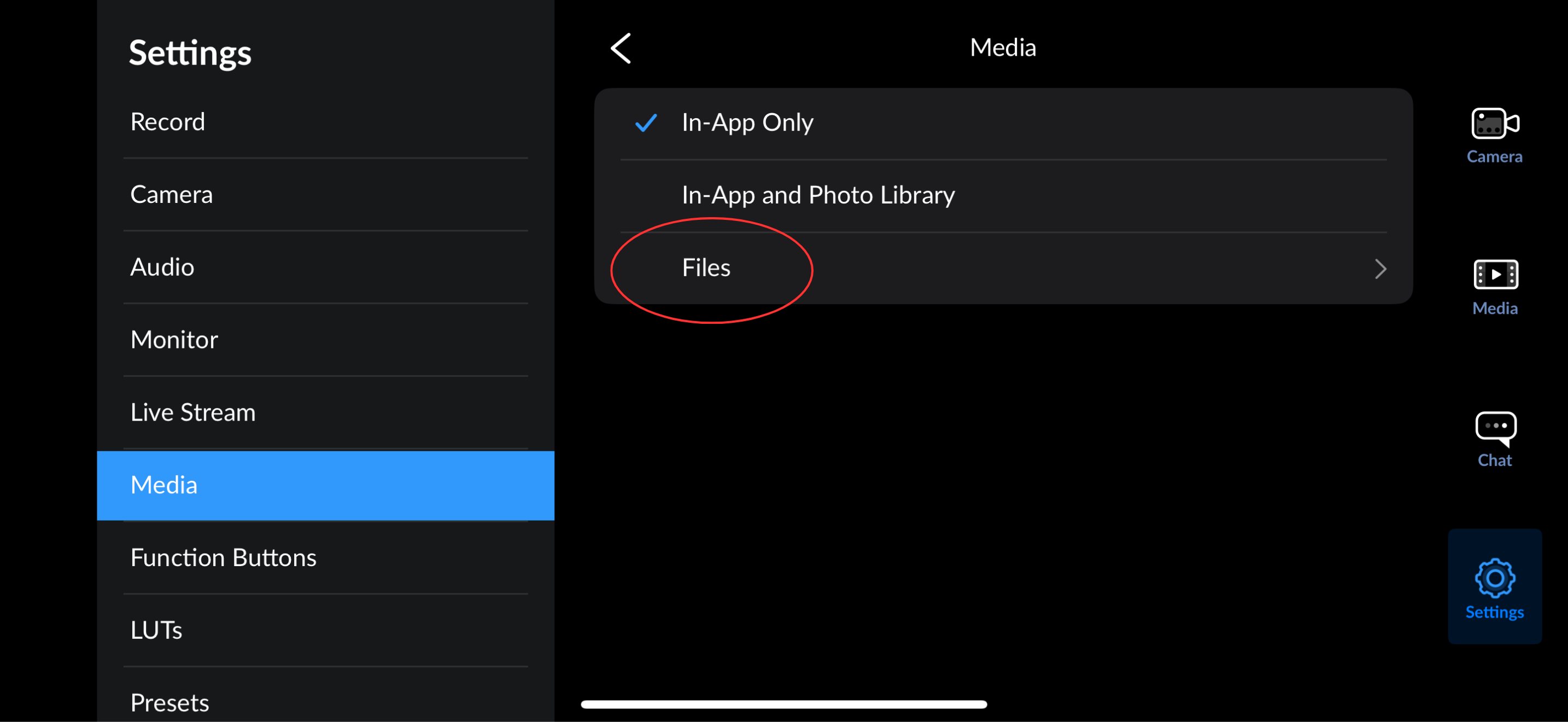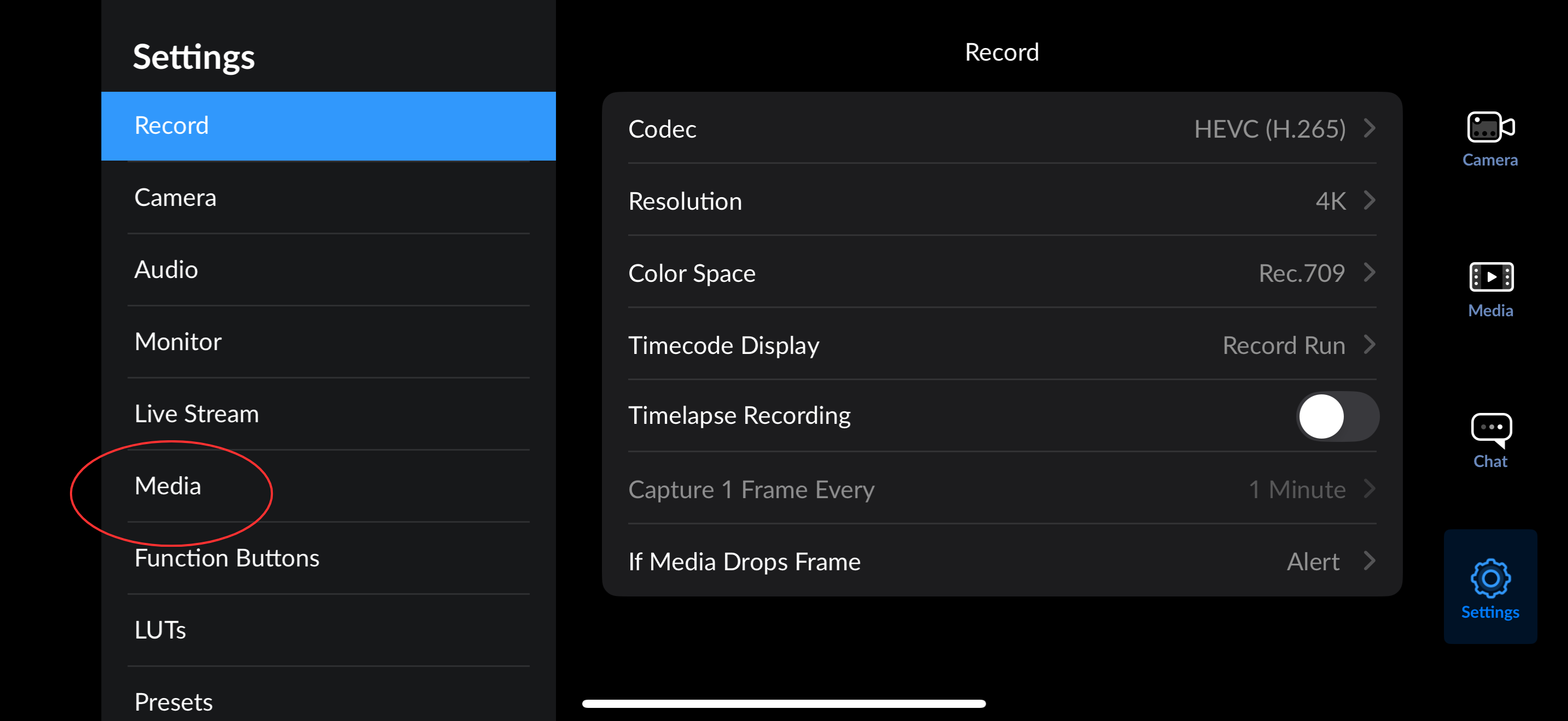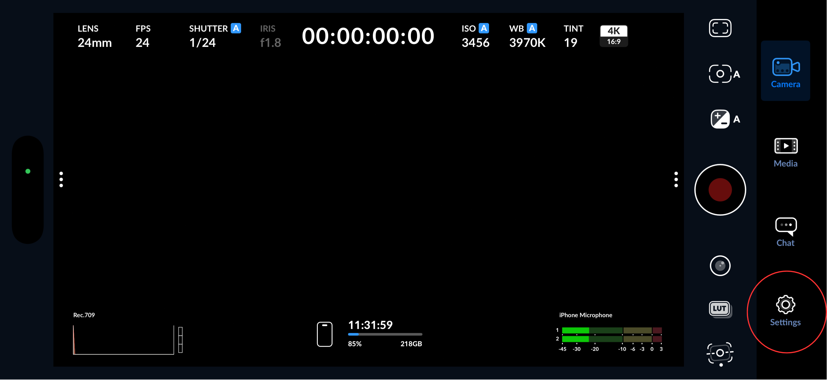 1) Connect your PGM12 and insert your desired capacity CFexpress Type A card and plug it into your mobile device. Now you can open the Blackmagic app and select the “Settings” icon on the bottom right hand corner.